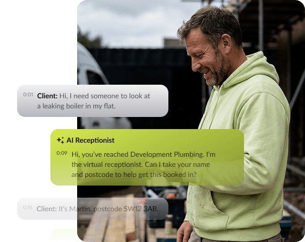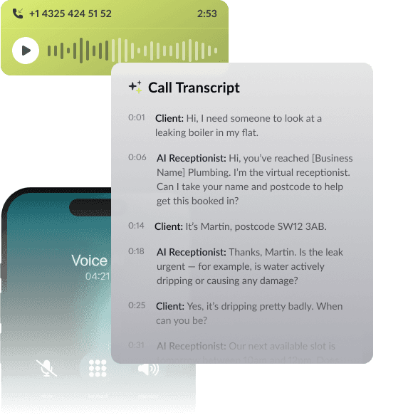 Your AI receptionist answers every call, captures job details, and books work — even when you can’t.